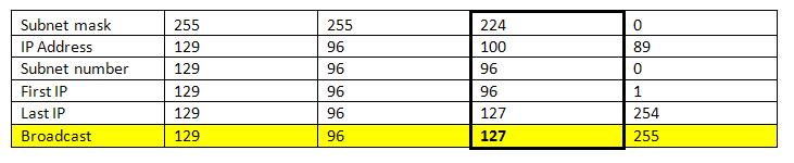 4th octet of First IP row: Subnet number value from 4th octet +1, so is 0+1=1