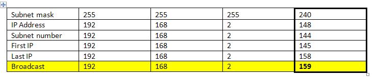 11. Copy first three octets from Broadcast. Into the 4th octet type Broadcast value from 4th octet -1, so is 159-1= 158